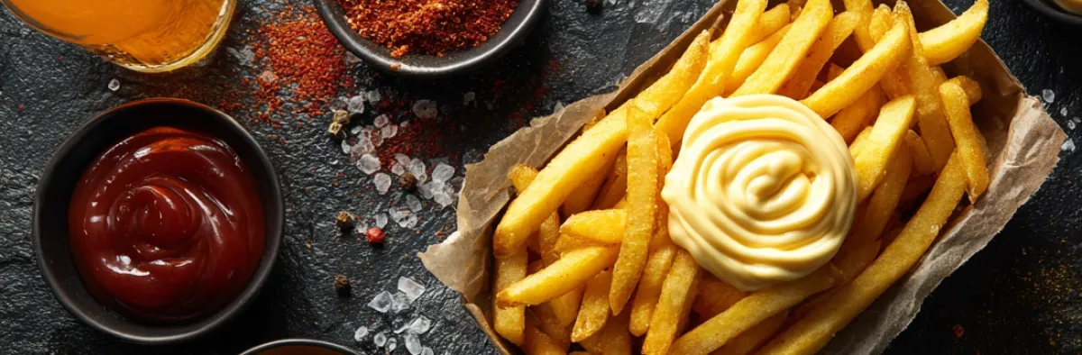 Knusprige Kartoffelsticks mit Mayonnaise, Tomatenketchup und Zwiebeln